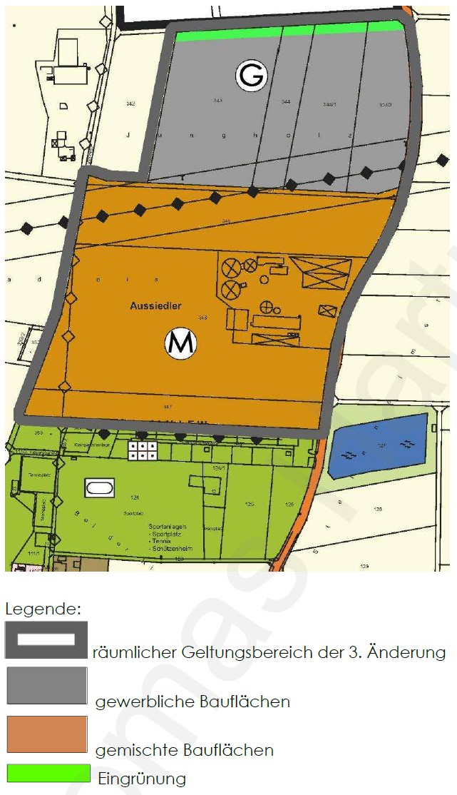 Da der rechtsgültige Flächennutzungsplan der Gemeinde auf dem überplanten Gelände Flächen für die Landwirtschaft ausweist, erfolgt im Parallelverfahren eine Änderung des Flächennutzungsplanes, um diesen vorhabenbezogenen Bebauungsplan aus dem Flächennutzungsplan entwickeln zu können. Der Umgriff ist dabei größer und umfasst auch potenzielle Erweiterungsflächen westlich des Bebauungsplanes sowie die Biogasanlage südlich davon.