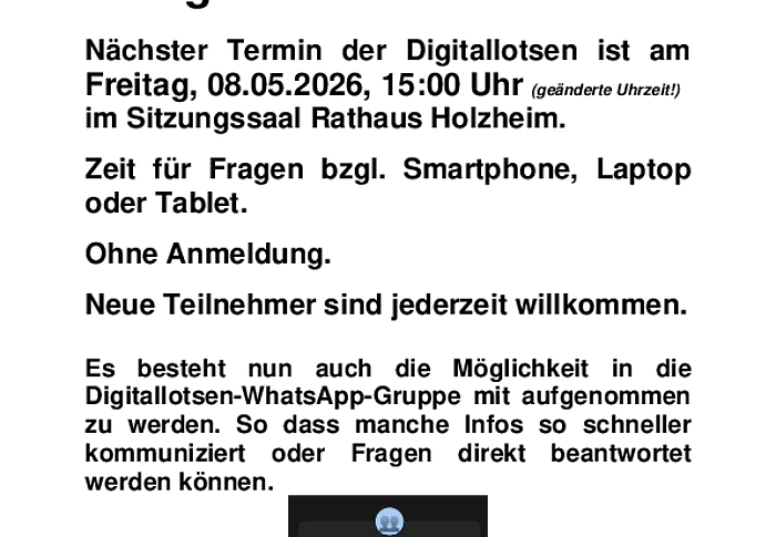 Am Mittwoch, 22. April 2026 um 19:30 Uhr findet im Sitzungssaal Holzheim, Kirchstraße 14, 89291 Holzheim eine öffentliche Sitzung des Gemeinderats Holzheim statt. Tagesordnung      1.Beratung und Beschlussfassung: Ausbau des Dachgeschosses und Erweiterung der Terrasse auf dem Grundstück Flur-Nr. 47/2 Gem. Holzheim2.Verabschiedung der ausscheidenden Gemeinderäte3.Verschiedenes Zu dieser Sitzung ist die Bürgerschaft recht herzlich eingeladen. Im Anschluss findet noch eine…